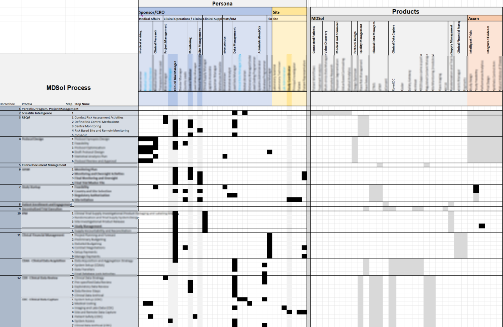 Our company did a platform wide assessment of product and persona coverage as part of integration discussions post-acquisition. I took a massive spreadsheet with 25-30 pages of lookup tables and condensed it down into a single, explorable spreadsheet with collapsing sections to show more detail on demand. Crunching all of this data down into a single view was a fun visualization task, and I like to call the resulting spreadsheet our product Rosetta Stone. It’s too clunky to operate for detailed tasks, but it was very helpful as an overview of the end-to-end clinical trial process, our persona, and how they engage with the products at each step of the way.